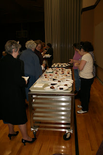 It included 5 of our sweetest sisters being spotlighted (tables displaying pictures, items they’d made, etc), their V.T. spotlighted them telling stories and interesting things about them. They came to the front and we crowned them, gave them a corsage, a box of chocolates and a homemade craft bag (I made those so I will post a pic soon). All the sisters were so cute!!! We also had a lovely homemade cheesecake dessert (last picture), a slide show of hands and service, and a musical presentation…Tabitha sang “His Hands.” The evening was beautiful with red and white tablecloths and roses in the centerpiece vases(that all the sisters took home at the end) and chocolate kisses along the tables. We also had handouts at each place setting the had lyrics to the song on the video (“my sisters hands” by Sally Deford) and a scroll with a poem about the rose on it. Oh and heart shaped sugar cookies on doilies! It was such a great night (only a couple technical difficulties but all and all it was wonderful!)