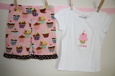 Crafting with my sister!! My goal was to make my little Sammy her summer wardrobe. Well I didn’t get them all done but most are cut out. Cute little modest shorts and some matching tops. Once I finish the others I will get them posted. We made our own pattern for the shorts using a pair of shorts I already had for her that I liked. Modified them a little, added ruffles to some and this is what we got! Adorable. I just bought the shirts and embellish them to match, the cupcake was an iron-on I found at JoAnn’s.