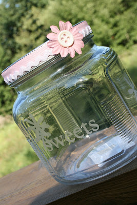 I decorated this Jar($3) I found at Wal-Mart with some ribbon, a flower, and button. I also was able to take it to an Enrichment night where we did glass etching! (Otherwise buying your own glass etching can be costly). It turned out so cute and I filled it candy and gave it as a gift. Love It!!