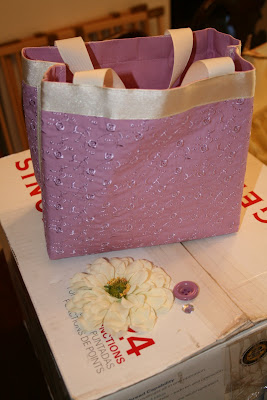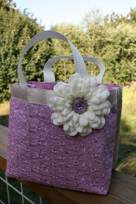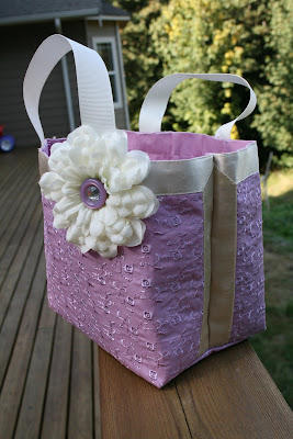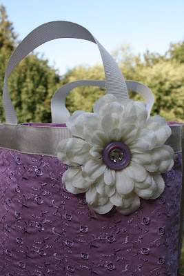 This is so simple to make!! All you need is a place mat (found this one at the $1 store) Sew the sides together then sew the corners in and trim. Add ribbon for handles and embellish. I used a fake flower with a purple button and rhinestone. Turned out so cute!