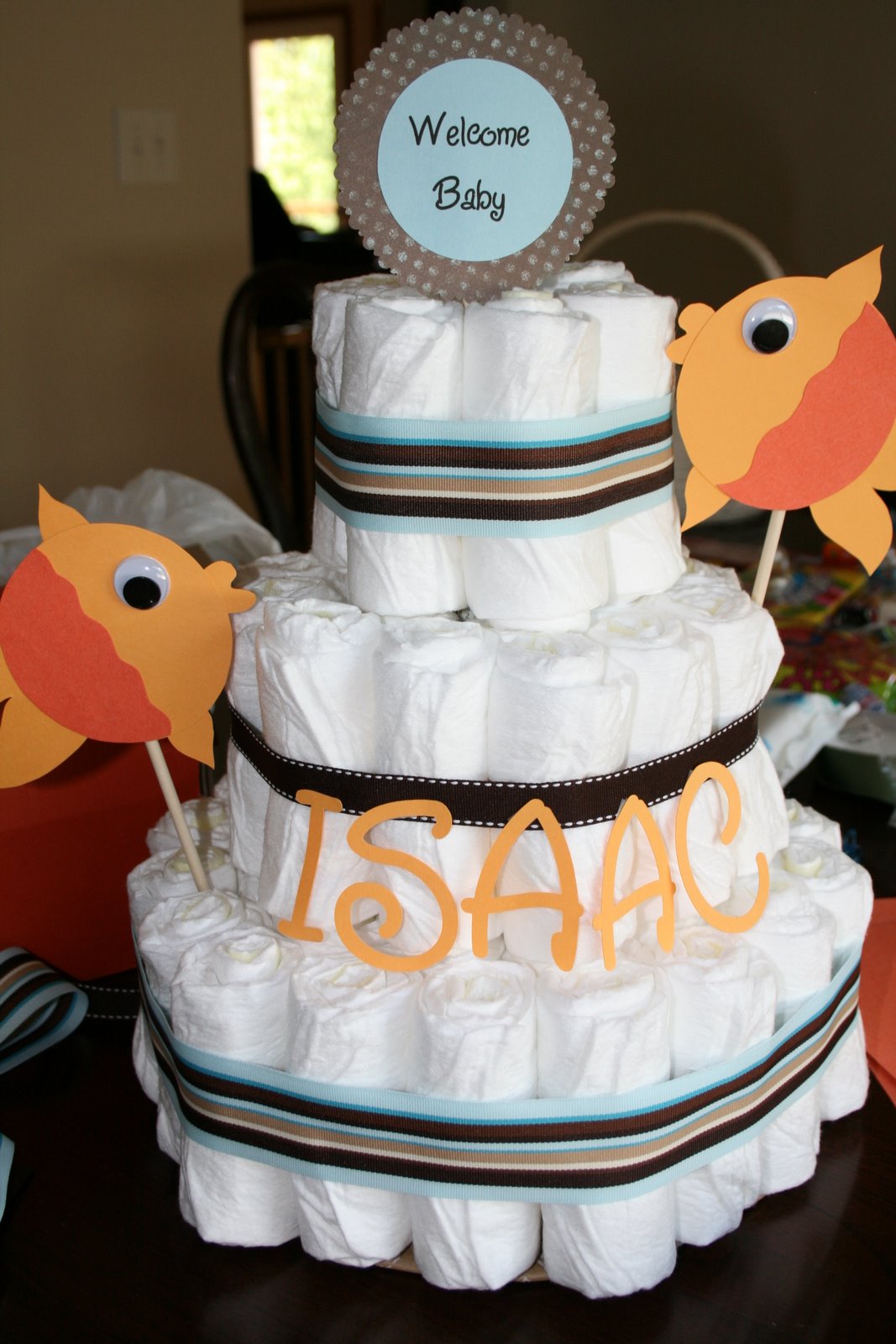 I threw a baby shower last weekend for my girlfriend who had just had a baby boy Isaac. Here is the diaper cake I made…