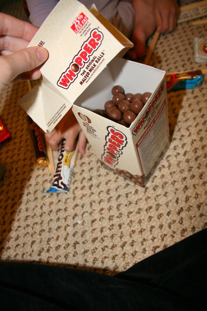 Gather your supplies…. variety of candy bars, sticks, whoppers, Styrofoam(or extra whoppers), tissue paper or other embellishments…