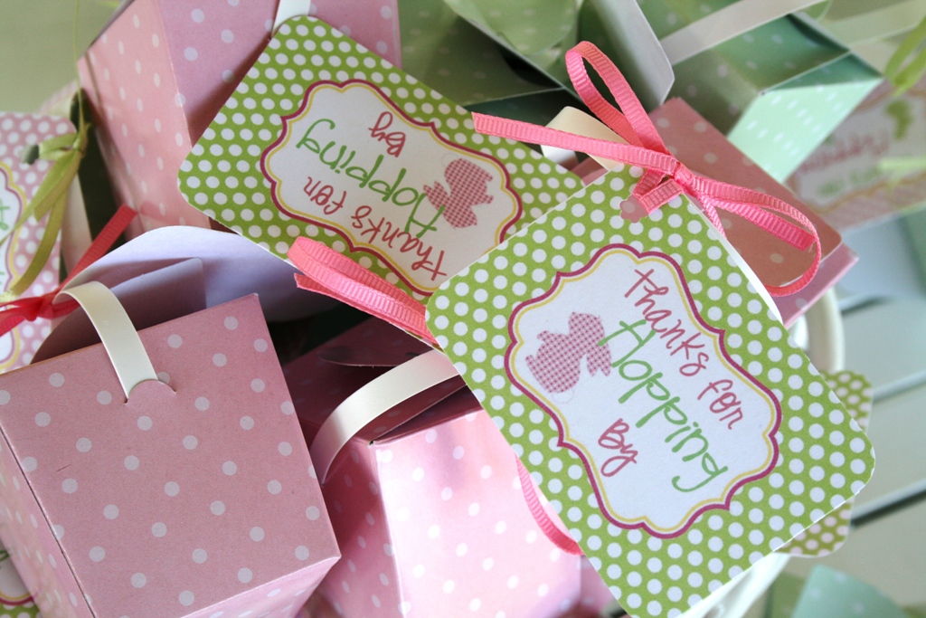 Treat boxes for when your bunny guests leave…. Little boxes found at the $store, typed wording on the printable tags found HERE. These were filled with marshmallow bunnies.