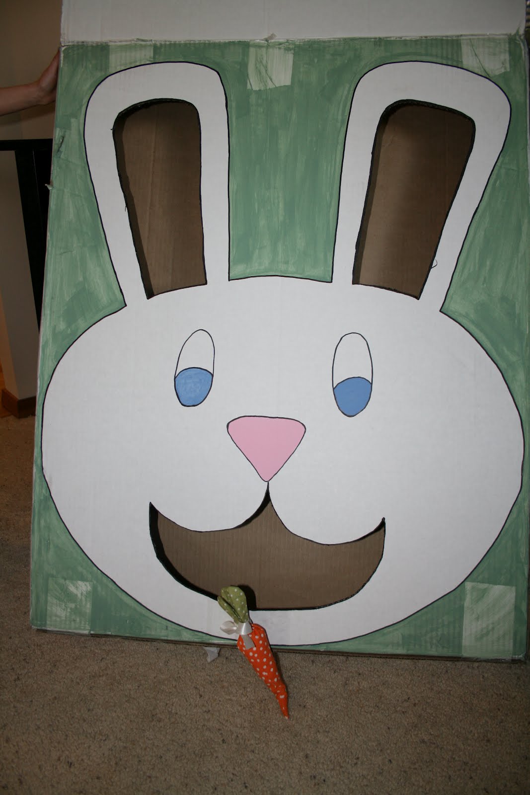 Using a large cardboard box draw a bunny head on box with pencil. Outline with permanent marker and paint in where desired….Cut out holes (I used an exacto knife) Make carrots… tutorial found here.