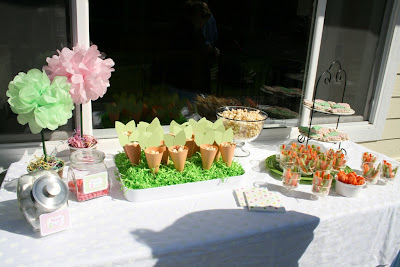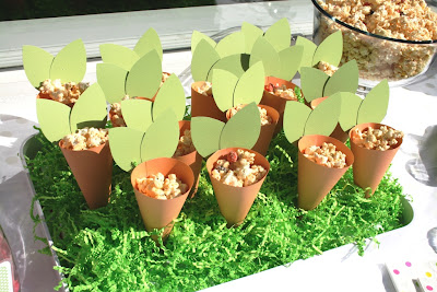 Bunny Munch!!! Made carrot cones out of cardstock and stuck them in a tray with piece of styrofoam at the bottom, and covered it with paper grass. Bunny Munch recipe found HERE, Carrot cone Tutorial found HERE.