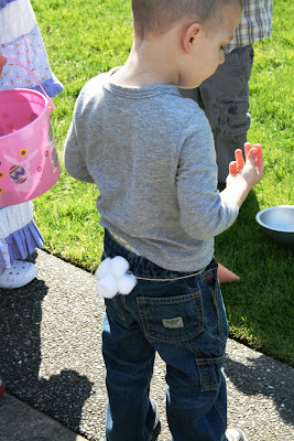 Egg Toss…plastic eggs, little plastic buckets with Easter grass in them..