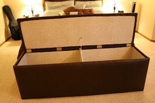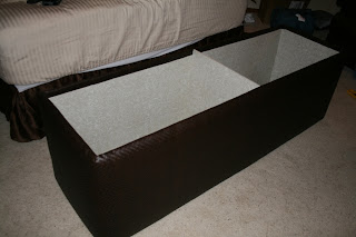**Okay after lots of request I finally took measurements. (Remember I have a cal-king bed, you may need to make your bench width longer or shorter for your bed). We used 3/8″ thick plywood. The front, back, bottom and top pieces of wood are about 68-1/2 inches by 20-1/4 inches. The ends and center divider are about 19-1/2 inches wide by 20-1/4 inches tall(If your plywood is not 3/8″ you will need to adjust this measurement). Screw your sides to the ends and center divider together first(your ends and center will sit inside the 2 side parts), then lay your bottom on and screw it in place.