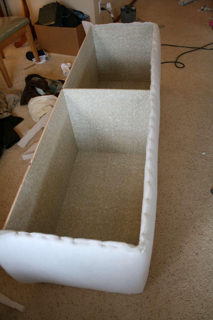 *Attach the bottom by drilling holes and adding screws. We used 2 layers of thick 1 inch batting around the front/and sides(found at JoAnns on a big spool), staple to the wood at top and bottom edge…here it is all stapled. (pull tight)