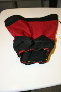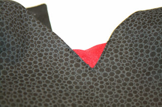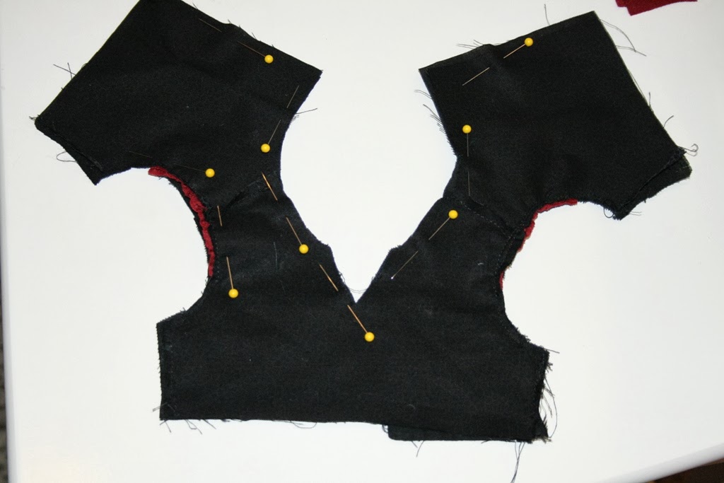 Pin and sew where shown below (arm holes, back, neckline, back, and the other arm hole-mine is already sewn in this picture on the right)