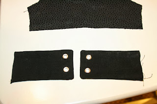 Now take your 4 rectangle pieces and sew them right-sides together on 3 sides, leaving one short side open (see above photo, top piece). Clip the 2 corners you have sewn and flip to right-side (the bottom rectangle). You will have 2. Now use a eyelet tool to punch holes in your fabric (see below).