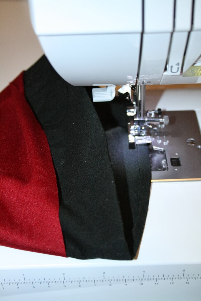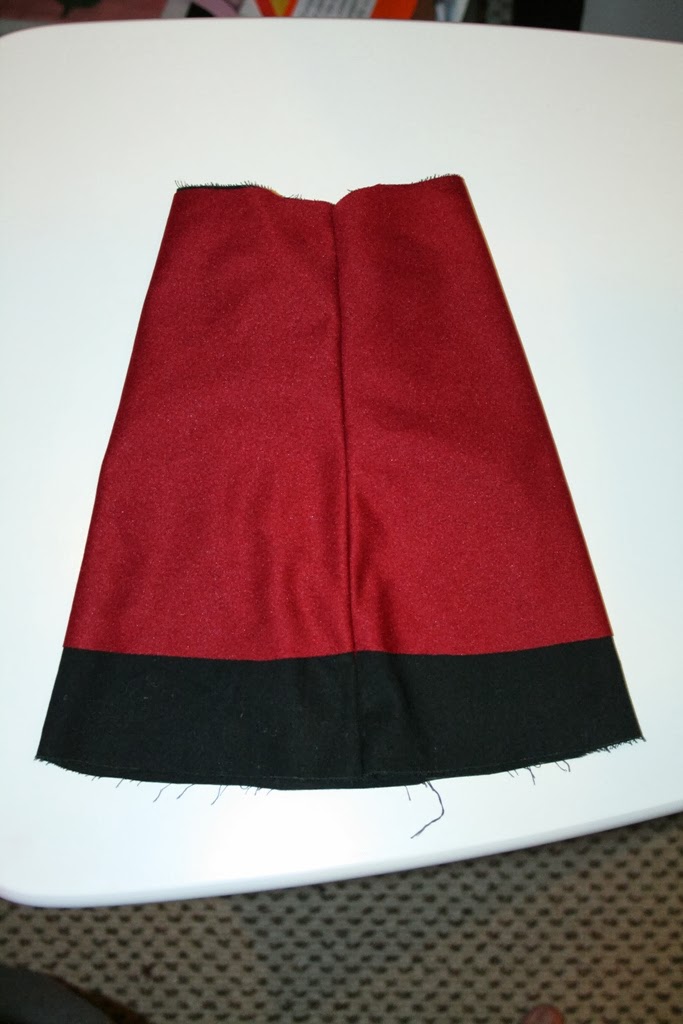 *note: my red fabric is some kind of knit and does not fray so I didn’t have to finish the raw edge of the skirt, if you are using a fabric that frays simply make the skirt 1/2 and inch longer and hem before making skirt.