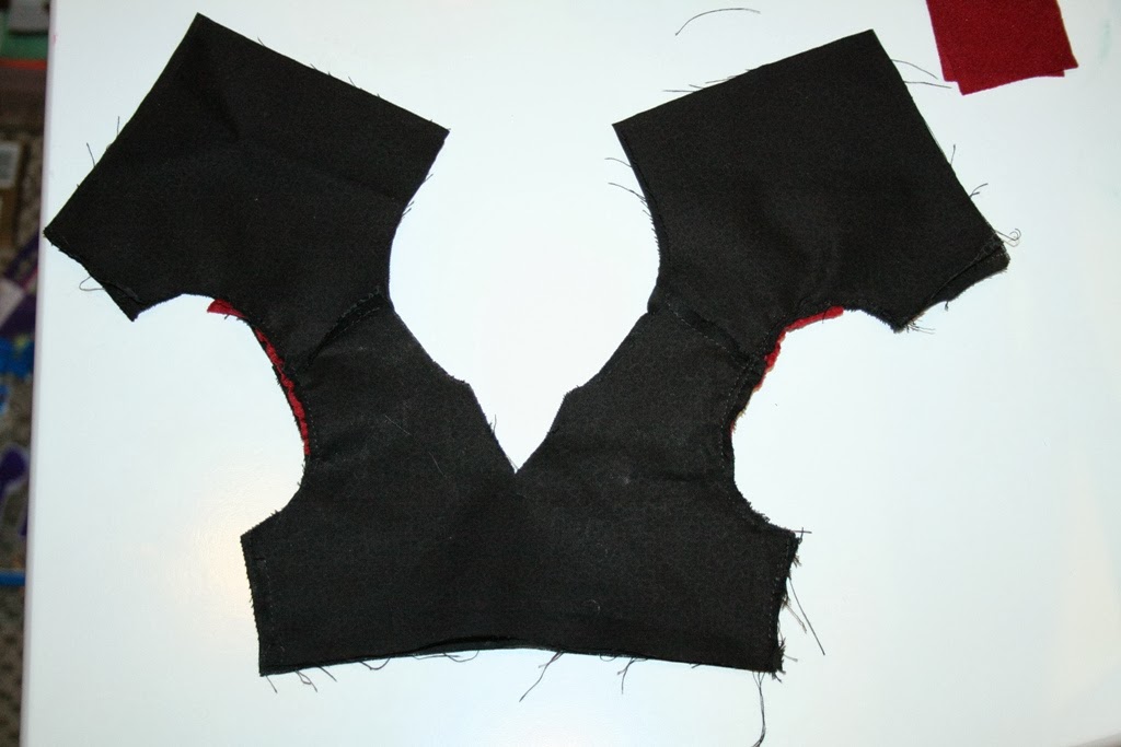 Now pull the 2 back pieces through the narrow shoulder, flipping it right-side out. Now only your sides and bottom of the bodice are still un-sewn.
