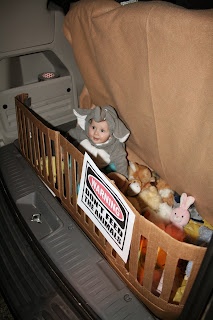 This was by far the funniest thing ever!! A Zoo themed trunk for Trunk or Treat. I threw this together last minute, just cut up a cardboard box with an exacto knife and filled our trunk with stuffed animals (and our Elephant!), It was so funny!